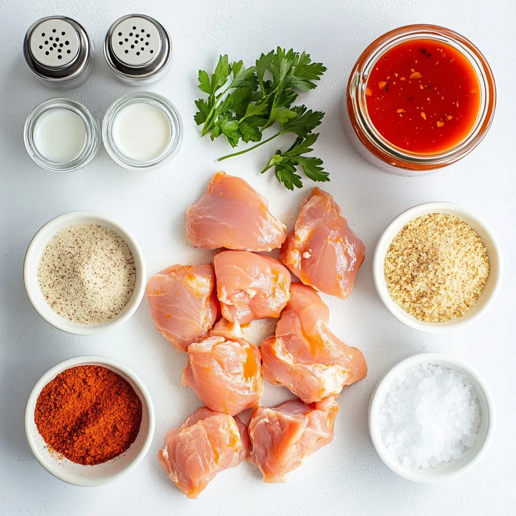 The main ingredients for Air Fryer Buffalo Chicken Bites start with chicken breast. I like to dice it into small, bite-sized pieces. This helps the chicken cook evenly and makes it easy to eat. Next, I soak the chicken in buttermilk. This step is crucial as it tenderizes the meat and adds flavor.