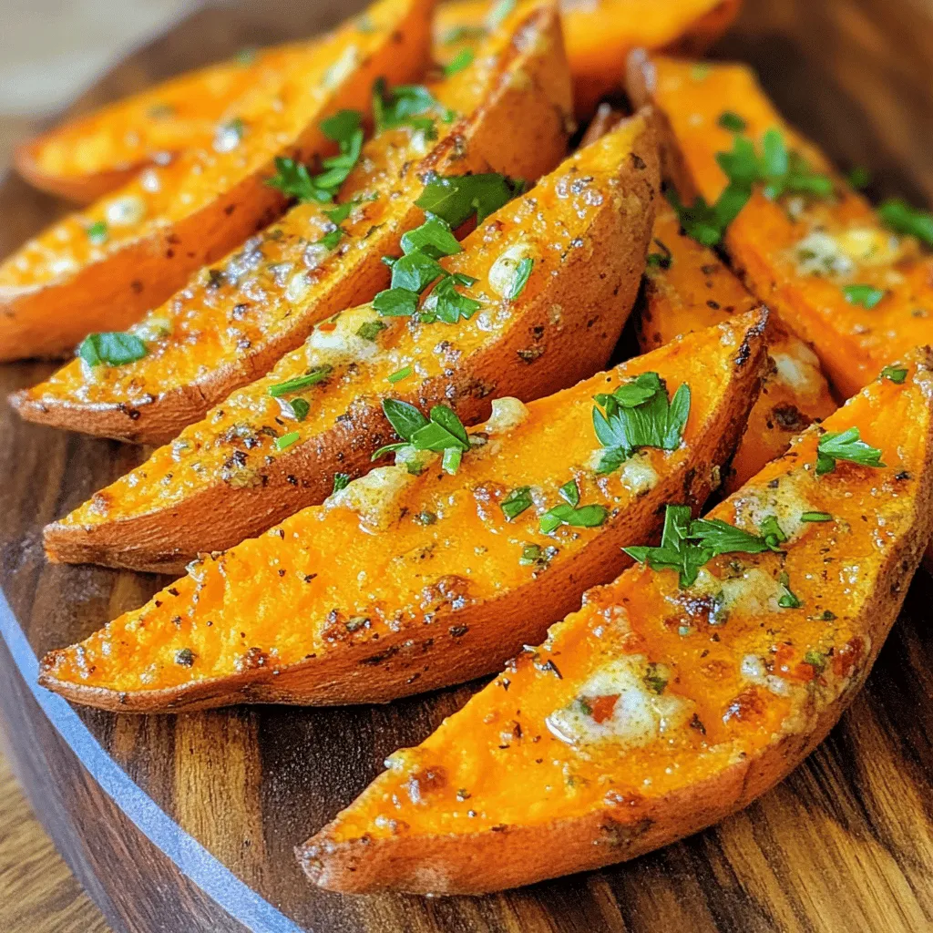 - 2 large sweet potatoes, thoroughly scrubbed and cut into wedges - 3 tablespoons unsalted butter, melted - 4 cloves of garlic, finely minced - 1 teaspoon smoked paprika for a subtle heat - 1 teaspoon dried oregano for herbal flavor - 1/2 teaspoon sea salt - 1/4 teaspoon freshly cracked black pepper - 2 tablespoons fresh parsley, finely chopped (for a vibrant garnish) - Air fryer - Mixing bowl - Whisk - Cutting board - Knife When picking sweet potatoes, look for firm ones. They should have smooth skin and no dark spots. Size matters too; larger potatoes yield bigger wedges. For measuring ingredients, use a standard set of measuring spoons and cups. This keeps your flavors balanced and ensures a tasty outcome. Remember, precise measurements make a difference in cooking! First, preheat your air fryer to 400°F (200°C). This step is crucial. It helps the wedges get crispy. Let it heat for about 5 minutes. While it warms up, let's make the garlic butter. In a large bowl, mix together 3 tablespoons of melted butter, 4 minced garlic cloves, 1 teaspoon of smoked paprika, 1 teaspoon of dried oregano, 1/2 teaspoon of sea salt, and 1/4 teaspoon of black pepper. Whisk it all together until it blends well. This mixture will give your sweet potatoes a rich flavor. Next, add the sweet potato wedges to the garlic butter mixture. You should have about 2 large sweet potatoes cut into wedges. Toss the wedges gently in the bowl. Make sure each wedge gets a nice coat of the garlic butter. This step is key for flavor. You want every bite to burst with that delicious garlic taste. Now, it’s time to cook! Place the coated sweet potato wedges in the air fryer basket. Make sure they are in a single layer. Avoid overcrowding, as this helps them cook evenly. If you have too many, cook them in batches. Air fry the wedges for 15-18 minutes. Halfway through, shake the basket to ensure they crisp up evenly. You want them golden brown and crispy. Once they look perfect, take them out and let them rest for a couple of minutes. This helps them become even crispier. Finally, serve the wedges on a platter and sprinkle some chopped parsley on top for a nice touch! To make your sweet potato wedges crispy, follow these steps: - Cut your sweet potatoes into even wedges. This ensures they cook at the same rate. - Soak the wedges in water for about 30 minutes. This helps remove excess starch. - Dry them well with a towel before coating. Moisture can lead to sogginess. - Use enough oil in your garlic butter mix. This helps them crisp nicely in the air fryer. - Shake the basket halfway through cooking. This allows hot air to circulate around the wedges. You can boost the flavor with these tips: - Add a pinch of cayenne pepper for heat. - Try fresh herbs like rosemary or thyme for a fragrant twist. - Sprinkle some Parmesan cheese on top once cooked for a savory touch. - Mix in a bit of lemon zest for a bright flavor. - Experiment with different spices like cumin or chili powder for unique tastes. If your sweet potato wedges turn out soggy or burnt, here’s what to do: - For soggy wedges, ensure they are not crowded in the air fryer. Cook in batches if needed. - If they burn, lower the cooking time or temperature. Every air fryer varies. - Check the wedges for doneness early; they may need less time than suggested. - If you see uneven cooking, shake the basket more often. This helps them cook evenly. {{image_4}} You can easily adjust this recipe to fit your needs. For a vegan option, swap out the butter for vegan butter. It works just as well and still gives you that rich flavor. You can also play with the seasonings. Try adding chili powder for some heat or a dash of cinnamon for a sweet twist. These sweet potato wedges shine as a side dish, but they can do more. Serve them with a fresh salad for a light meal. They pair well with grilled chicken or fish. You can even top them with black beans, avocado, and salsa for a fun twist. The options are endless! No air fryer? No problem! You can bake these wedges in the oven. Preheat your oven to 425°F (220°C). Spread the coated wedges on a baking sheet in a single layer. Bake for 25-30 minutes, flipping halfway through. If frying, heat oil in a pan. Fry the wedges until golden brown, about 5-7 minutes per side. This gives you crispy wedges without the air fryer! To keep your sweet potato wedges fresh, let them cool first. Place the wedges in an airtight container. This helps retain moisture and flavor. You can store them in the fridge for up to four days. If you want to keep them longer, freeze the wedges. Wrap them tightly in plastic wrap or foil before placing them in a freezer bag. When it’s time to enjoy your leftovers, the air fryer is your best friend. Set it to 350°F (175°C). Place the wedges in a single layer and heat for about 5-7 minutes. This will help them regain their crispiness. If you don’t have an air fryer, you can use the oven. Preheat it to 350°F (175°C) and bake the wedges for about 10 minutes. If stored properly, your sweet potato wedges last for about four days in the fridge. In the freezer, they can last up to three months. Just remember, the sooner you eat them, the better the taste and texture will be! For this recipe, I recommend using Garnet or Jewel sweet potatoes. These types are sweet and creamy. They have a rich orange color and cook nicely in the air fryer. Look for firm ones without blemishes for the best flavor. Yes, you can prep the sweet potatoes in advance. Cut them into wedges and store in water for up to 24 hours. This keeps them fresh and prevents browning. You can also toss them in the garlic butter mix ahead of time. Just store them in the fridge until you're ready to cook. Sweet potato wedges taste great with different dips. Here are some ideas: - Garlic aioli: Creamy and flavorful, it complements the garlic butter. - Spicy ketchup: Adds a kick and enhances the sweetness. - Honey mustard: Offers a sweet and tangy flavor contrast. - R
