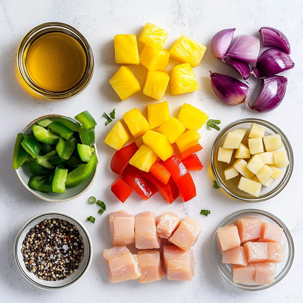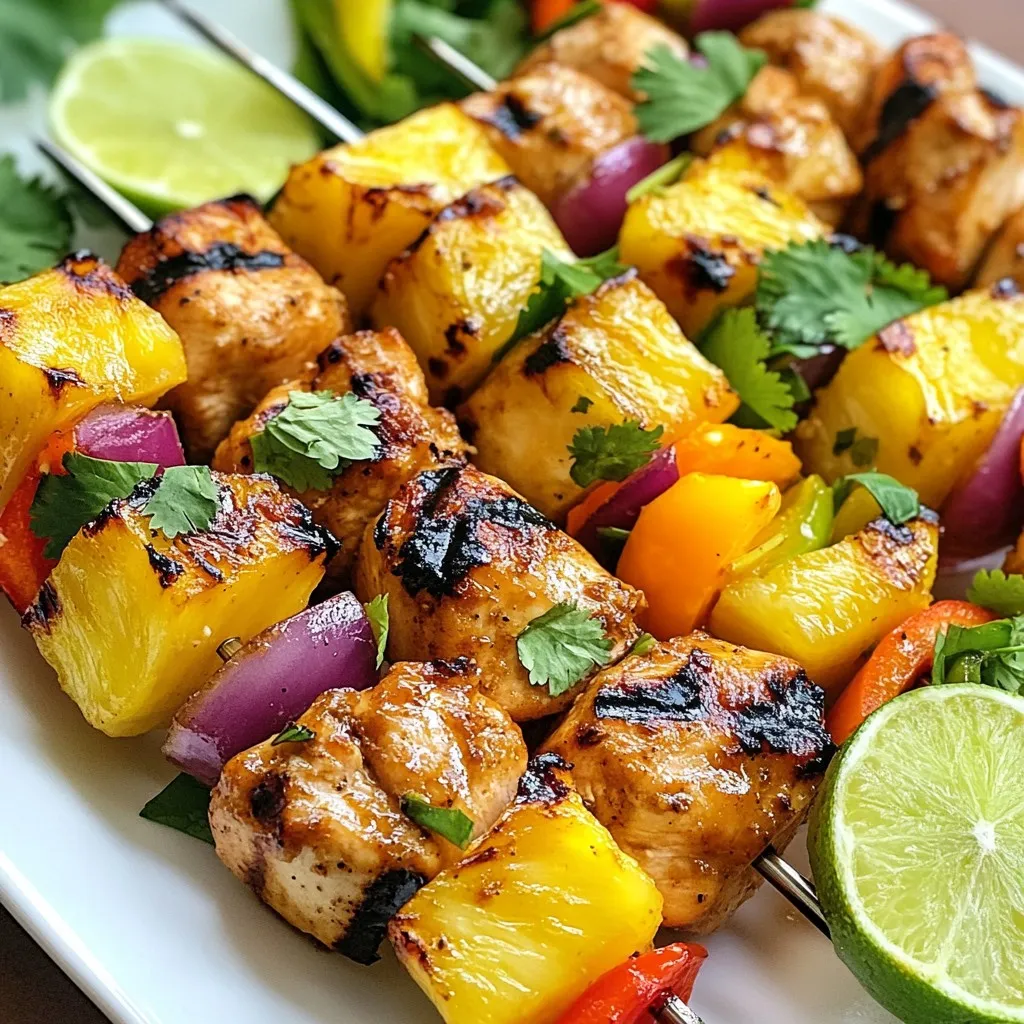 To make BBQ pineapple chicken kabobs, gather these key items: - 1 lb chicken breast, cut into 1-inch cubes - 1 cup fresh pineapple, cut into 1-inch chunks - 1 red bell pepper, cut into 1-inch squares - 1 green bell pepper, cut into 1-inch squares - 1 medium red onion, cut into 1-inch pieces These ingredients provide great taste and color. The chicken gives protein, while the veggies add crunch. Pineapple brings sweetness and helps balance the savory flavors. For a tasty marinade, you will need: - 1/4 cup soy sauce - 2 tablespoons honey - 2 tablespoons olive oil - 2 cloves garlic, minced - 1 teaspoon ground ginger - Salt and pepper to taste Mix these items to create a flavorful sauce. The soy sauce adds umami. Honey gives sweetness. Olive oil keeps the chicken moist. Garlic and ginger bring warm notes to the dish. When serving, arrange the kabobs on a nice platter. Here are some ideas: - Garnish with fresh cilantro or parsley for a pop of green. - Drizzle extra honey over the kabobs for added sweetness. - Serve with lime wedges for a zesty finish. These touches enhance the dish's look and taste. Feel free to pair these kabobs with rice or a fresh salad for a complete meal. Enjoy! {{ingredient_image_2}} To make the marinade, start by grabbing a medium bowl. Add 1/4 cup of soy sauce, 2 tablespoons of honey, and 2 tablespoons of olive oil. Then, add 2 minced garlic cloves and 1 teaspoon of ground ginger. Mix it all well until smooth. This marinade adds a sweet and savory taste to your chicken. Next, take 1 pound of chicken breast, cut into 1-inch cubes. Place the chicken into the marinade. Make sure each piece is fully coated. Cover the bowl with plastic wrap or a lid. Put it in the fridge for at least 30 minutes. For even more flavor, let it marinate for up to 2 hours. While the chicken is soaking up the flavors, preheat your grill to medium-high heat. Grab your skewers and start assembling. Thread the marinated chicken, along with 1 cup of fresh pineapple chunks, red and green bell pepper squares, and red onion pieces onto each skewer. Alternate the colors for a fun look. Now, place the kabobs on the grill. Cook them for about 10 to 12 minutes. Turn them often to ensure even cooking. The chicken should reach an internal temperature of 165°F. In the last few minutes, brush on any leftover marinade for extra flavor. Once they’re done, let the kabobs rest for a few minutes before serving. To get juicy chicken, marinate it well. Use a mix of soy sauce, honey, olive oil, garlic, and ginger. This blend adds flavor and helps keep the chicken moist. Make sure to coat each piece fully. Cover and chill for at least 30 minutes; two hours is even better. This gives the chicken time to soak up the tasty marinade. For those perfect grill marks, heat your grill to medium-high. Place the kabobs on the grill and do not move them for the first few minutes. This helps create those nice lines. After three to four minutes, turn them 90 degrees. This way, you get crosshatch marks. Flip the kabobs after another three to four minutes. How you serve the kabobs can make a big difference. Use a large platter for a nice look. Arrange the kabobs in a fan shape for visual appeal. Add a sprinkle of fresh herbs like cilantro or parsley on top. Drizzle a little honey over them for shine and sweetness. Serve with lime wedges for a zesty touch. These small details make a big impact! Pro Tips Soak Your Skewers: If using wooden skewers, soak them in water for at least 30 minutes before grilling to prevent them from burning on the grill. Marinate Longer: For the best flavor, let the chicken marinate for up to 2 hours. This allows the flavors to penetrate the meat more deeply. Alternate Ingredients: When assembling your kabobs, alternate the chicken, vegetables, and pineapple to ensure even cooking and a visually appealing presentation. Check Temperature: Use a meat thermometer to ensure the chicken reaches an internal temperature of 165°F for safe consumption. {{image_4}} You can swap chicken for other meats. Try shrimp for a lighter option. Pork also works well, offering a nice sweetness. If you want a vegetarian dish, use firm tofu. Just press it first to remove excess water. This helps it soak up the flavors better. Mix up your veggies for more variety. Zucchini adds a nice texture and flavor. Cherry tomatoes give a pop of color and sweetness. Mushrooms are great for an earthy taste. Feel free to experiment with your favorites. Just keep all pieces about the same size for even cooking. To boost flavor, add a splash of lime juice or apple cider vinegar. These give a tangy kick. Try adding herbs like cilantro or basil for freshness. A pinch of red pepper flakes can add a spicy twist. Always taste the marinade before using it. Adjust to fit your flavor preferences. To keep leftover BBQ pineapple chicken kabobs fresh, place them in an airtight container. Make sure the kabobs cool down first. You can store them in the fridge for up to three days. Always label the container with the date to track freshness. When you’re ready to eat your kabobs again, you can reheat them easily. The best method is to use an oven. Preheat your oven to 350°F (175°C). Place the kabobs on a baking sheet and cover them with foil. Heat for about 10-15 minutes. This keeps them juicy. You can also use a microwave, but they may dry out. Heat them in short bursts, checking often. If you want to store kabobs for a longer time, freezing is a good choice. Wrap each kabob tightly in plastic wrap or foil. Then, place them in a freezer-safe bag. You can freeze them for up to three months. When you’re ready to cook, thaw them overnight in the fridge before reheating. This helps keep the taste and texture intact. You can check if the chicken is done by using a meat thermometer. The chicken should reach an internal temperature of 165°F. You can also cut into a piece to see if it is no longer pink inside. Make sure the juices run clear. If they are still p