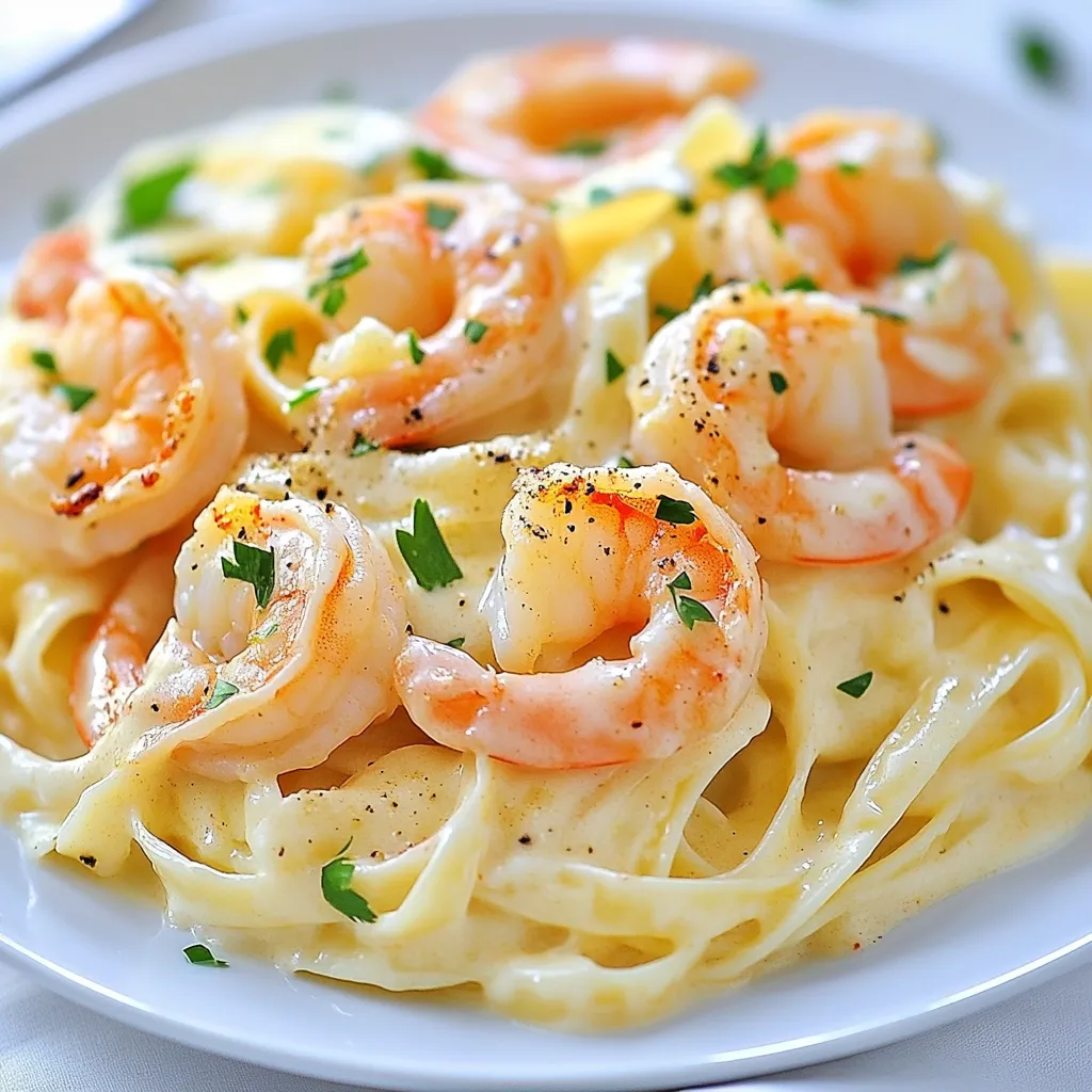 A creamy and spicy pasta dish featuring sautéed shrimp and fettuccine in a rich Alfredo sauce.