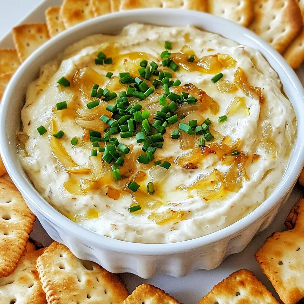 A rich and creamy dip featuring sweet caramelized onions, perfect for any gathering.