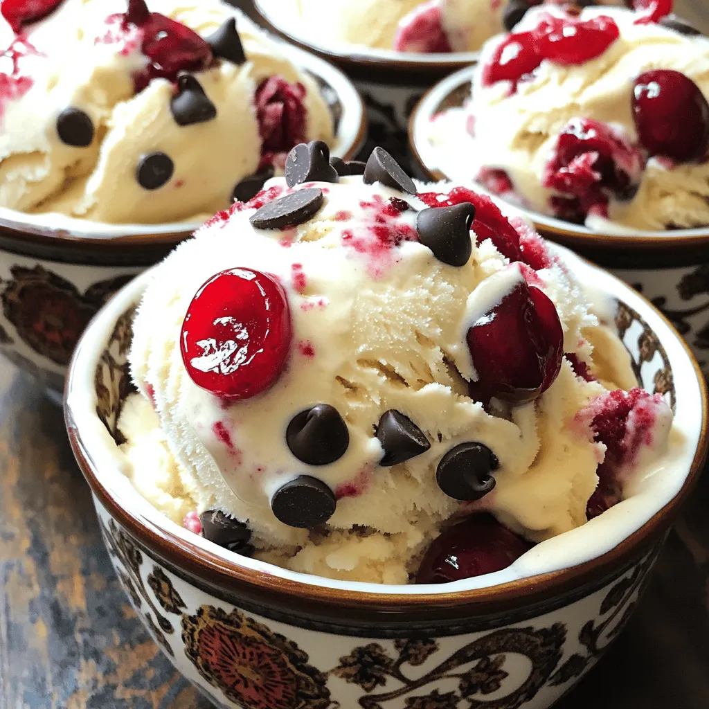 To make Cherry Garcia ice cream, you need a few simple items. Heavy cream gives it a rich base. Whole milk adds creaminess, while granulated sugar sweetens it just right. The vanilla and almond extracts bring out the flavors. Cherries add a fruity burst, and dark chocolate chips make it extra special.