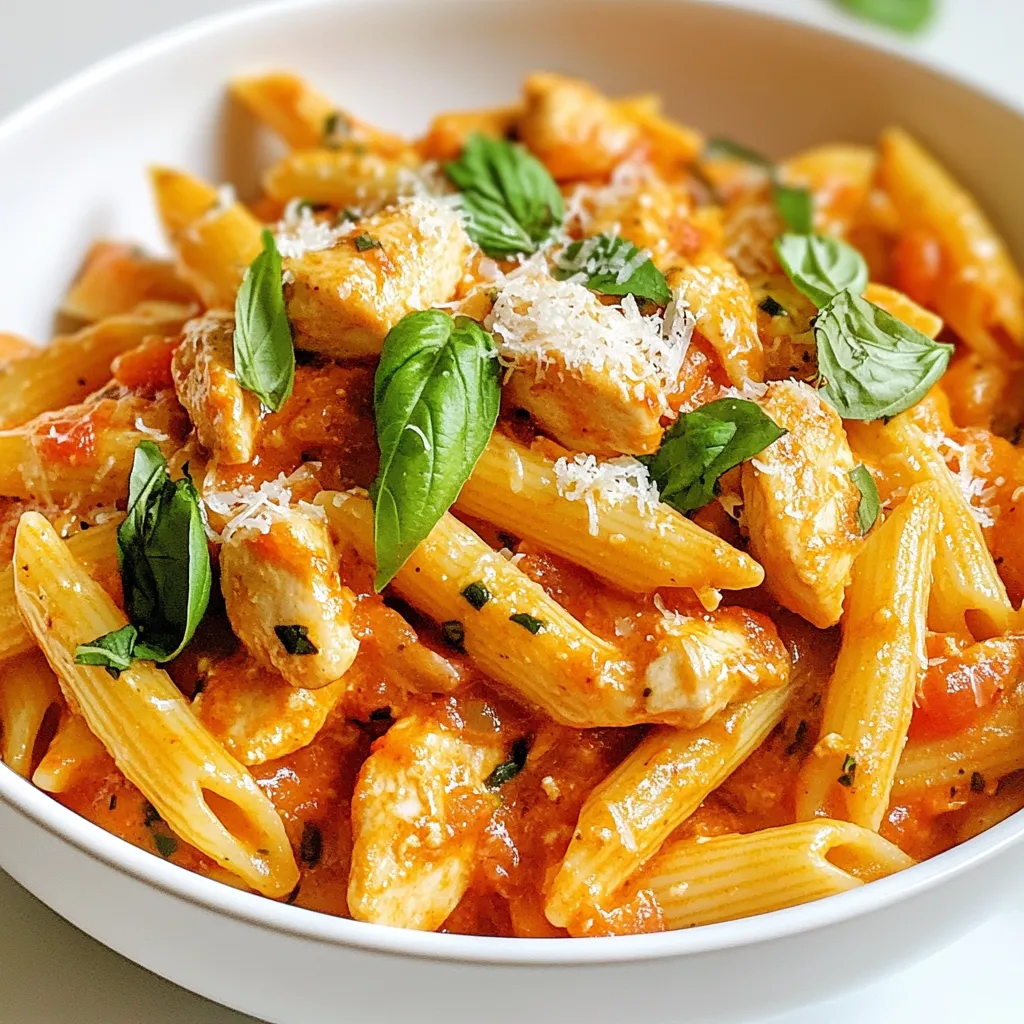 A flavorful and comforting pasta dish with creamy tomato sauce, chicken, and fresh basil.
