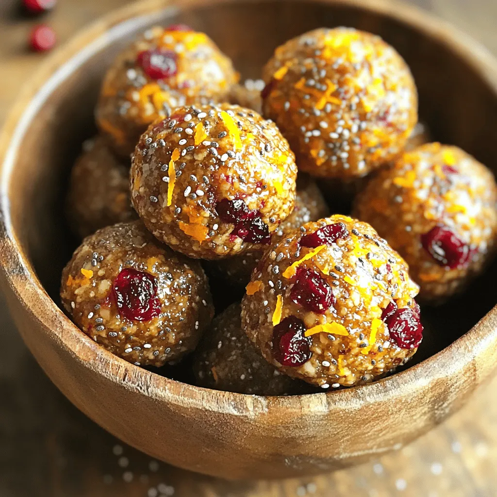 - 1 cup rolled oats - 1/2 cup almond butter (or substitute with peanut butter) - 1/4 cup honey or maple syrup These main ingredients form the base of your energy bites. Rolled oats give them a hearty texture. Almond butter adds healthy fats and a creamy feel. Honey or maple syrup sweetens the bites naturally, making them a treat. - 1/2 cup dried cranberries, finely chopped - 1/4 cup freshly grated orange zest - 1/4 cup chia seeds Now, let's talk about flavor. Dried cranberries add a sweet and tangy burst. They also give a nice chewiness. Freshly grated orange zest brings a bright citrus note. Chia seeds add crunch and boost nutrition. They are rich in fiber and protein. - 1/2 teaspoon ground cinnamon - A pinch of salt Seasonings can elevate your bites. Ground cinnamon adds warmth and depth. Just a pinch of salt balances the sweetness. These simple additions enhance the overall taste and make each bite delightful. Start by gathering your ingredients. In a medium bowl, combine 1 cup of rolled oats, 1/2 cup of almond butter, and 1/4 cup of honey or maple syrup. Use a spatula to mix them until they blend together well. This step creates a strong base for your energy bites. It should feel sticky and hold together. Next, it's time to add in some fun flavors. Mix in 1/2 cup of finely chopped dried cranberries, 1/4 cup of freshly grated orange zest, 1/4 cup of chia seeds, 1/2 teaspoon of ground cinnamon, and a pinch of salt. Stir well to ensure everything is evenly spread throughout the mix. The orange zest gives a bright taste, while the chia seeds add crunch and nutrition. After mixing, cover the bowl with plastic wrap and place it in the fridge for about 30 minutes. This helps the mixture firm up, making it easier to shape. Once chilled, remove the bowl and get ready to roll. With clean hands, scoop out about 1 tablespoon of the mixture and roll it into a ball. Repeat until you shape all the mix into 12 to 15 bites. If you want, roll each bite in coconut flakes or crushed nuts for added texture. Store your energy bites in an airtight container in the fridge, and enjoy them fresh for up to a week. Chilling the mixture is key to great energy bites. It helps the ingredients bind together. When you chill the mixture for about 30 minutes, it firms up nicely. This makes rolling easier and keeps the bites from falling apart. Trust me, skipping this step can lead to a messy experience. For extra flavor and fun, try rolling your bites in coconut flakes or crushed nuts. Both add great texture. Coconut gives a sweet, tropical twist. Crushed nuts add crunch and healthy fats. Choose what you like best! You can even mix both for a colorful, tasty finish. Use a medium-sized mixing bowl to combine the ingredients. A sturdy spatula or wooden spoon works best for mixing. For storage, opt for airtight containers. This keeps your energy bites fresh. Use small containers for easy grabbing when you’re on the go. {{image_4}} If you need a nut-free option, swap almond butter for sunflower seed butter. This change keeps the texture smooth and creamy, just like almond butter. Sunflower seed butter offers a nutty taste that pairs well with cranberries and orange. It’s also a great choice for those with nut allergies. You can adjust the sweetness of your energy bites easily. Instead of honey, try using agave syrup. Agave syrup is sweeter, so you might need less of it. If you prefer, simply reduce the amount of honey used in the recipe. This way, you control how sweet your snacks are, making them just right for your taste. Feel free to get creative with your energy bites! Dried fruits like apricots or raisins can add new flavors. You can also mix in seeds such as pumpkin or sunflower seeds for extra crunch. These add-ins not only enhance the taste but also boost the nutrition of your bites. Experimenting with different fruits and seeds can lead to your perfect snack! To keep your cranberry orange energy bites fresh, store them in an airtight container. This helps prevent moisture and air from spoiling them. You can use glass or plastic containers with tight seals. Always remember to label your container with the date. This way, you’ll know when you made them. These energy bites stay fresh in the refrigerator for up to a week. After that, they may lose their taste and texture. If you notice any changes in smell or appearance, it’s best to throw them out. Always check before snacking! Freezing is a great option for longer storage. To freeze, place the energy bites in a single layer on a baking sheet. Freeze them for about two hours until firm. Then, transfer them to a freezer-safe bag or container. They can last in the freezer for up to three months. When you’re ready to eat, just thaw them in the fridge overnight. Enjoy your tasty snack anytime! These energy bites stay fresh in the refrigerator for up to one week. I suggest placing them in an airtight container to keep them tasty. They maintain their flavor and texture well during this time. If you find that you cannot eat them all, you can also freeze them for longer storage. Absolutely! You can swap ingredients based on your taste. For almond butter, try peanut butter or sunflower seed butter for a nut-free option. Maple syrup is a great choice instead of honey. You can also use any dried fruit, like raisins or apricots, instead of cranberries. These energy bites are packed with health benefits. Rolled oats provide fiber for digestion. Almond butter adds protein and healthy fats. Chia seeds are full of omega-3 fatty acids. Dried cranberries offer antioxidants, while orange zest brings vitamin C to the mix. Together, they create a balanced snack that fuels your day! These energy bites are easy to make and tasty. We mixed oats, almond butter, and honey for a great base. Then, we added fun flavors like cranberries, orange zest, and chia seeds. Don't forget to chill the mixture for the best texture. Use your favorite nut butters or sweeteners for variety. Store th
