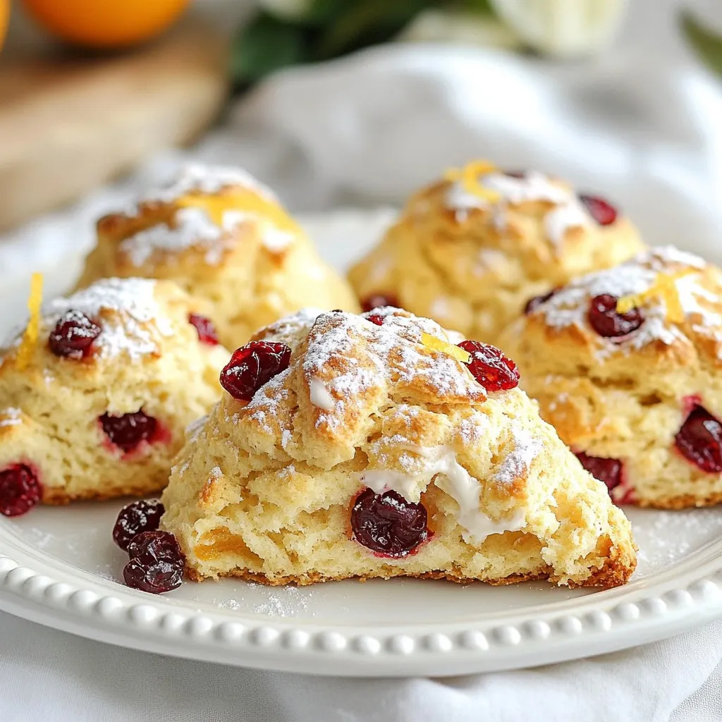 Arrange the scones on a rustic wooden platter, enhancing their appeal with fresh orange slices and a scattering of extra cranberries for a pop of color. Serve with clotted cream or butter on the side for a truly indulgent treat!