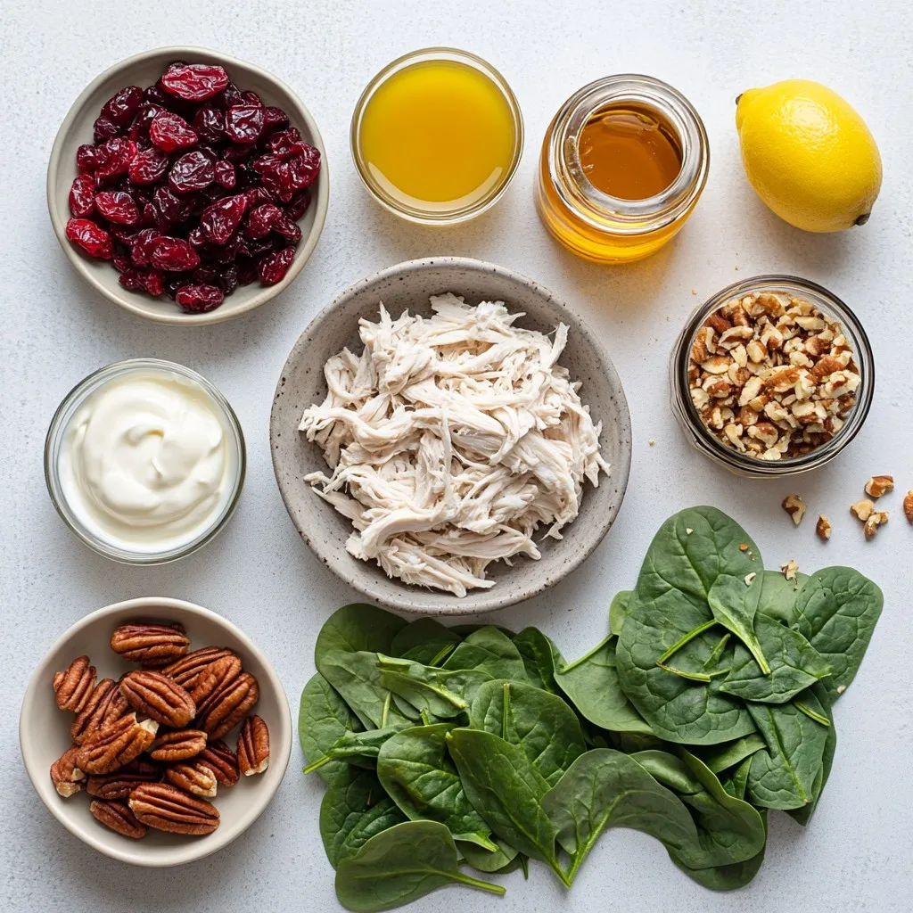 The main ingredients in this salad pack a punch of flavor and nutrition. The cooked chicken breast provides protein, while fresh spinach adds vitamins. Dried cranberries give a sweet burst, and pecans add a nice crunch.