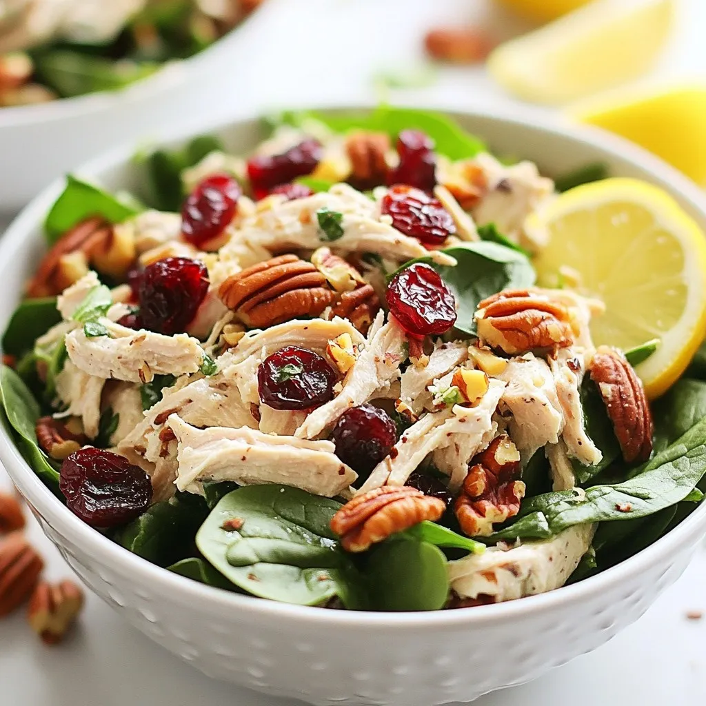 To start, you need to gather your ingredients. In a large mixing bowl, combine the shredded chicken, chopped spinach, dried cranberries, and chopped pecans. Use a gentle tossing motion to mix everything evenly. Be careful not to break the spinach too much. This step helps create a colorful and tasty base for your salad.