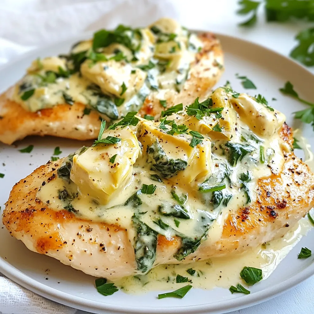 A delicious and creamy chicken dish featuring spinach and artichokes, perfect for a comforting meal.