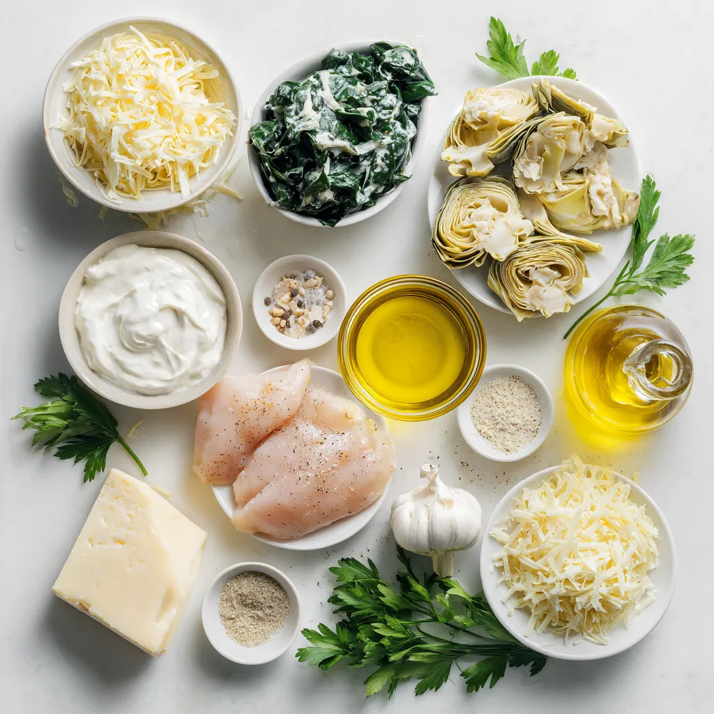 Start by getting your oven ready. Preheat it to 375°F (190°C). This step is key for cooking the chicken evenly. Next, gather your ingredients. You will need chicken breasts, spinach, artichokes, cream cheese, sour cream, mozzarella, Parmesan, garlic, onion powder, garlic powder, olive oil, salt, and pepper. Finely chop the spinach and artichokes. Mince the garlic. This makes the cooking process smooth.