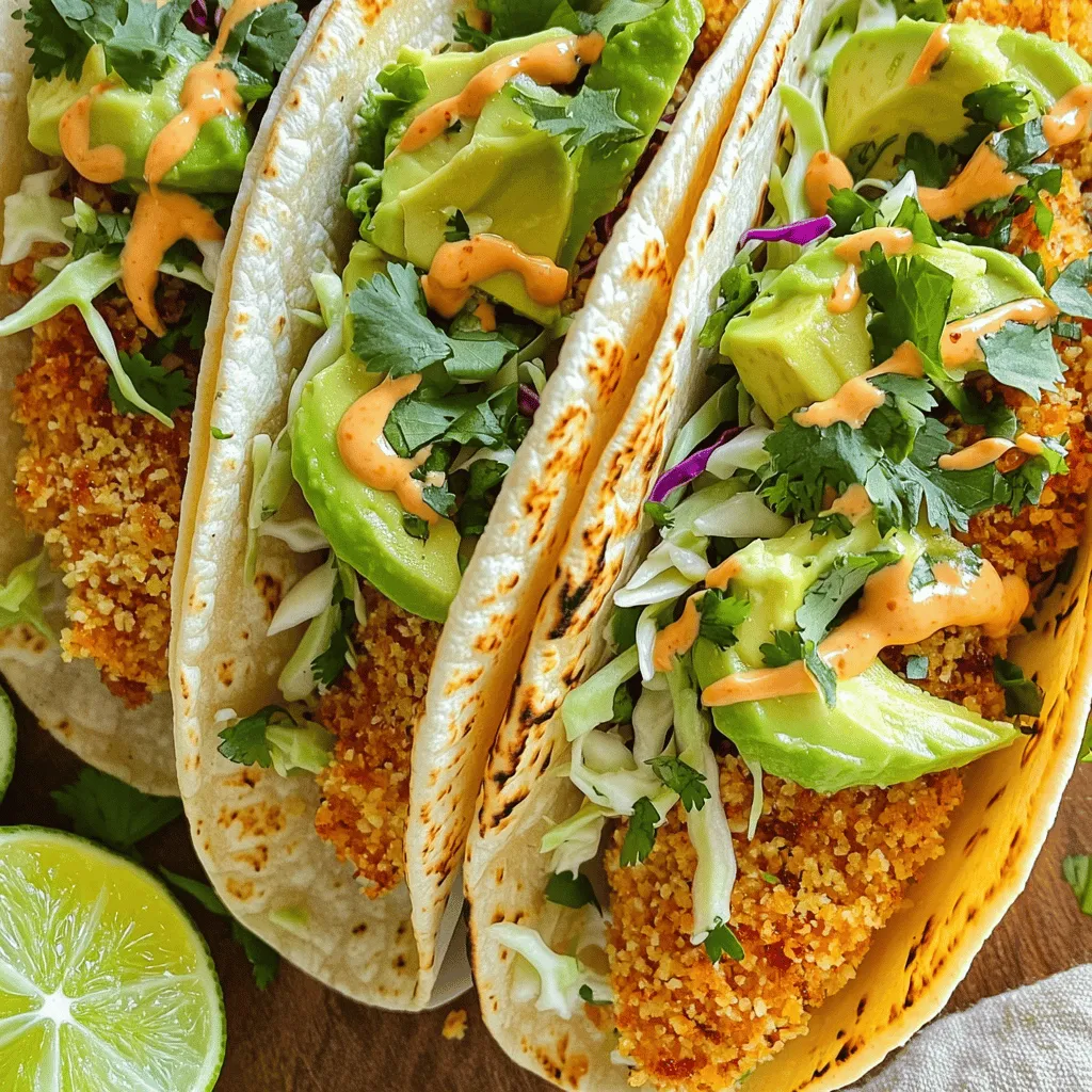 - 1 lb white fish fillets (cod or tilapia) - 1 cup panko breadcrumbs - 1/2 cup all-purpose flour - 2 large eggs - 1 teaspoon garlic powder - 1 teaspoon paprika - 1 teaspoon cumin - Salt and pepper, to taste - Shredded cabbage, avocado, cilantro, lime wedges - Spicy mayo (1/4 cup mayonnaise mixed with 1 tablespoon sriracha) - Additional garnishes To make crispy panko crusted fish tacos, you need some simple ingredients. Let’s break it down. Main Ingredients: For the main part of our dish, choose fresh fish fillets. Cod and tilapia are excellent options. You will also need panko breadcrumbs for that delightful crunch. All-purpose flour helps the fish stick to the panko. You will need two large eggs to create a tasty coating. Seasonings and Toppings: Add flavor with garlic powder, paprika, and cumin. These spices make the fish pop. Don’t forget salt and pepper to taste. For toppings, use shredded cabbage for crunch, creamy avocado slices, and fresh cilantro. Lime wedges add a zesty touch. Optional Ingredients: If you want some heat, mix mayonnaise with sriracha for spicy mayo. This can elevate your tacos even more. Feel free to add extra garnishes to your liking. Using these ingredients, you will create a meal that is both easy and flavorful. Each component works together to bring taste and texture to your tacos. - Preheat the oven to 400°F (200°C). - Prepare fish by patting dry and seasoning. Start by preheating your oven. This helps the fish to cook evenly. While the oven heats, take your fish fillets and pat them dry with paper towels. This step is key. If the fish has moisture, the breading won’t stick well. Season both sides with salt, pepper, garlic powder, paprika, and cumin. This gives the fish a lot of flavor. - Set up a breading station with flour, eggs, and panko. - Dredge fish in flour, dip in eggs, and coat with panko. Now, let’s set up a breading station. You will need three shallow bowls. Put flour in the first bowl. In the second bowl, whisk two eggs until they are mixed well. Finally, fill the third bowl with panko breadcrumbs. Take a seasoned fish fillet and dredge it in the flour. Make sure to shake off any extra flour. Next, dip the fish into the eggs, coating it well. Lastly, press the fish into the panko. This gives it that crispy texture we love. - Arrange fillets on a baking sheet and bake for 12-15 minutes. - Warm tortillas and assemble the tacos with toppings. Place the breaded fish fillets on a lined baking sheet. For extra crispiness, lightly spray them with cooking spray. Put the baking sheet in the oven and bake for 12 to 15 minutes. You want the fish to be fully cooked and golden brown. While the fish bakes, warm your corn tortillas in a skillet for about 30 seconds on each side. This step helps them become soft and easy to fold. Once the fish is done, take it out and start putting together your tacos. Place a few pieces of the crispy fish on each tortilla. Top with shredded cabbage, avocado slices, and fresh cilantro. If you want a kick, drizzle on some spicy mayo and squeeze fresh lime juice over the top. To get that perfect crunch, drying the fish is key. Moisture makes the breading soggy. Use paper towels to pat the fish dry before seasoning. This simple step helps the spices stick and enhances the crispiness. Next, consider using cooking spray. A light spray on the breaded fish before baking adds an extra layer of crunch. The oil helps the panko brown up nicely, giving you a golden crust that is hard to resist. These tacos shine when served with sides. I love pairing them with rice or beans for a hearty meal. They add texture and flavor that complement the fish perfectly. Don't forget the lime wedges! A squeeze of fresh lime juice brightens the dish. If you like heat, drizzle spicy mayo on top. Mix mayonnaise with sriracha for an easy and tasty kick. Plating can make your tacos look extra special. Use a colorful platter to serve them. This adds visual appeal and makes the meal feel festive. Garnishing is also important. Fresh cilantro not only adds flavor but also brightens the dish. You can sprinkle some on top for a nice finish. A few lime wedges on the side create a vibrant look that invites everyone to dig in. {{image_4}} You can use many types of fish for your tacos. Cod and tilapia are popular choices. You can also try haddock or shrimp for a new twist. When choosing fish, look for fresh fillets. Fresh fish should have a mild smell and firm texture. Ask your fishmonger for the best options available that day. If you need a gluten-free option, use crushed cornflakes instead of panko. They give a nice crunch, too. You can also mix seasonings into your breadcrumbs. Try adding some garlic powder or paprika for extra flavor. This way, you can personalize your breading to match your taste. Customizing your tacos is fun! You can add salsa, pickled veggies, or even fresh herbs. For a fruity twist, try making a mango or pineapple salsa. Just chop the fruit and mix it with lime juice, salt, and chopped cilantro. This adds a fresh, zesty kick that pairs well with the crispy fish. To keep your leftover fish tacos fresh, place them in an airtight container. This helps prevent moisture loss and keeps flavors intact. You can store them in the fridge for up to three days. After that, the fish may lose its texture and taste. If you want to save some tacos for later, freeze them unassembled. Wrap the fish and tortillas separately in plastic wrap, then place them in freezer bags. This way, you can enjoy them in up to three months. When ready to eat, thaw the fish in the fridge overnight. To reheat your fish without losing its crispiness, use an oven. Preheat it to 350°F (175°C) and warm the fish for about 10 minutes. This keeps the coating crunchy. If you use a microwave, the fish may become soggy. So, always choose the oven for best results. For crispy fish tacos, I recommend white fish like cod or tilapia. These types of fish have a mild flavor and flaky