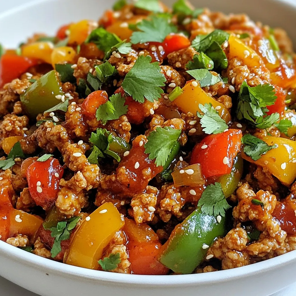 A spicy and flavorful ground chicken dish with bell peppers and a savory sauce.