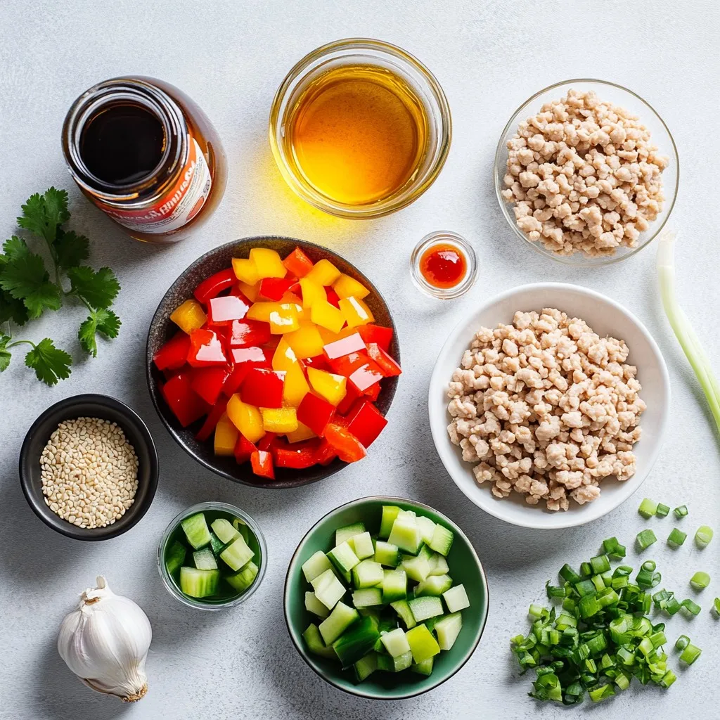 The heart of the dish is ground chicken. It cooks quickly and soaks up flavors well. I love using soy sauce for its salty depth. Sesame oil adds a nice nutty taste. Sriracha brings heat, which you can change based on your taste. Honey balances everything with its sweetness. Rice vinegar adds a nice tang.