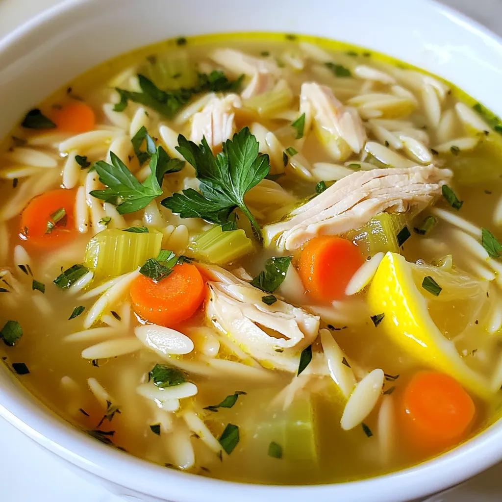 A refreshing and hearty chicken soup with lemon zest and orzo pasta.