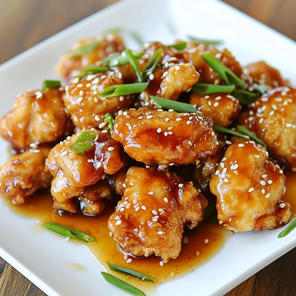 A delicious and crispy chicken dish coated in a sweet and savory honey garlic sauce, garnished with sesame seeds and green onions.
