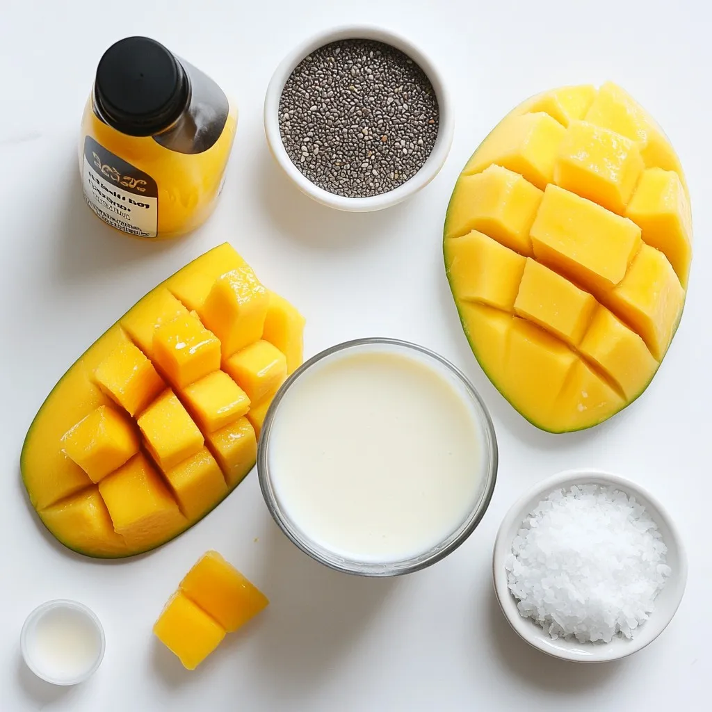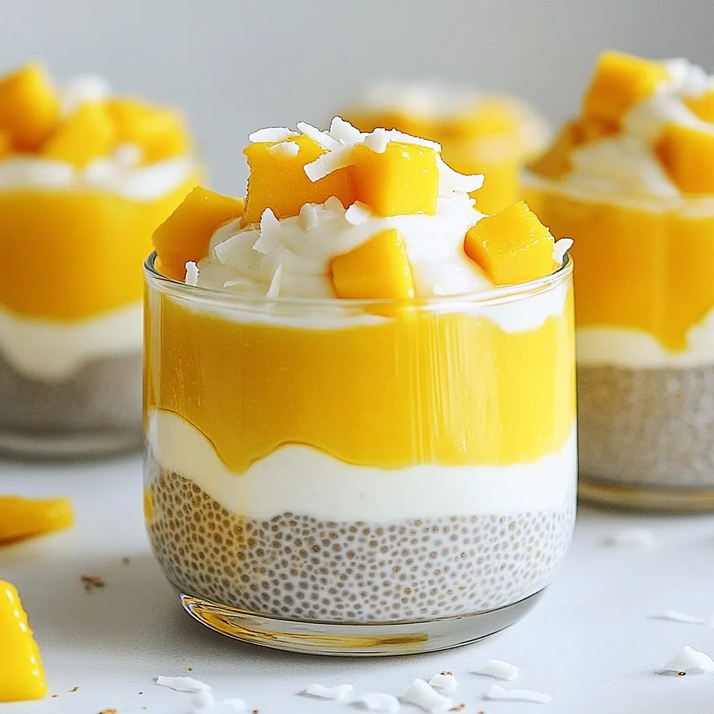 To make a flavorful Mango Coconut Chia Pudding, you need some key ingredients. Here’s what you will need: - 1 cup coconut milk (canned or fresh) - 1/2 cup almond milk (or your preferred milk) - 1/4 cup chia seeds - 2 tablespoons maple syrup (or honey for sweetness) - 1 ripe mango, pureed until smooth - 1/2 teaspoon vanilla extract - A pinch of sea salt - Fresh mango cubes and shredded coconut for topping These ingredients blend together to create a creamy and fresh treat. The coconut milk adds rich flavor, while the almond milk lightens it up. Chia seeds thicken the mix, making it satisfying and healthy. If you want to change the sweetness, you have options. Instead of maple syrup, try honey or agave syrup. Each sweetener gives a unique taste. You could also use stevia or monk fruit sweetener for a lower-calorie option. Adjust the amount according to your taste. Toppings can elevate your pudding. Add fresh mango cubes for a burst of flavor. Shredded coconut gives a fun texture. You can also use chopped nuts or seeds for crunch. A sprig of fresh mint on top adds a pop of color and freshness. The right toppings make your pudding look and taste amazing! {{ingredient_image_2}} Start by mixing your coconut milk and almond milk in a medium bowl. You can use canned or fresh coconut milk. This forms the creamy base of your pudding. Next, add the maple syrup and vanilla extract. A pinch of sea salt will help enhance the flavors. Whisk the mixture until it is well blended. Now it is time to add the chia seeds. Sprinkle them into the liquid slowly while stirring. This keeps the seeds from clumping together. Let the mixture rest for 5 minutes. Stir again to ensure the chia seeds spread out evenly. This step is key to achieving the right texture. Cover the bowl with plastic wrap or a lid. Place the bowl in the refrigerator. Chill for at least 3 to 4 hours, or overnight if you can. This waiting time allows the chia seeds to absorb the liquid and swell, turning into a pudding. When you mix the chia pudding, be gentle but thorough. You want to ensure that every seed has liquid around it. Stirring continuously while adding the seeds helps with this. After the initial resting time, a second stir is crucial. It helps the seeds settle evenly in the mixture. If you notice clumps forming, stir a bit more. The goal is a smooth, creamy pudding. Remember, the chia seeds will swell and thicken the mixture over time. So, patience is key! To make the beautiful marbled effect, start with a ripe mango. Puree it until it is smooth. Once your chia pudding has set, grab a serving bowl or jar. Spoon in the pudding first. Now, take your mango puree and gently swirl it into the pudding. Do not mix it completely; you want to see both layers. This creates a lovely visual effect that is as tasty as it looks. Finish by adding fresh mango cubes and a sprinkle of shredded coconut on top. This not only boosts flavor but adds texture too. Enjoy your creation! To make a creamy chia pudding, use the right ratio of liquid to seeds. I find that 1/4 cup of chia seeds to 1.5 cups of liquid works well. The chia seeds soak up liquid and expand. This gives the pudding its thick, creamy texture. Stir the mixture well after adding the seeds. Let it sit for five minutes, then stir again. This helps prevent clumps. Chill it for at least three to four hours, or overnight for the best results. Many people add too much liquid, which makes the pudding runny. Stick to the right ratios to avoid this. Another mistake is not stirring enough. Always stir after you add the seeds. This helps them distribute evenly. Avoid skipping the chilling time, as this step is crucial for thickening. Lastly, don’t rush the mango puree. A smooth mango adds a wonderful layer of flavor. For stunning presentation, use clear jars or bowls. This showcases the beautiful layers of chia pudding and mango. Swirl the mango puree gently to create a marbled effect. Top with fresh mango cubes and a sprinkle of shredded coconut for texture. You can also add a mint leaf for a pop of color. This makes each serving look and taste amazing. Pro Tips Perfect Chia Seed Mixture: Make sure to whisk the chia seeds thoroughly into the liquid to avoid clumping and ensure an even texture throughout the pudding. Chill Time Matters: For the best consistency, allow the pudding to chill overnight. This gives the chia seeds ample time to absorb the liquid and thicken properly. Mango Freshness: Use ripe mangoes for the best flavor. If mangoes are not in season, consider using frozen mango puree as a substitute. Layered Presentation: When serving, gently swirl the mango puree into the pudding for a marbled effect, making it visually appealing and delicious. {{image_4}} You can make this mango coconut chia pudding dairy-free by choosing the right milk. I love using coconut milk for its rich flavor. You can also try oat milk or soy milk. Almond milk works well too but keep in mind it has a lighter taste. If you prefer a nut-free option, use rice milk. Each choice alters the flavor slightly, so feel free to experiment. To add a twist to your pudding, mix in other flavors. A splash of lime juice brightens the mango taste. You can also add a spoonful of peanut butter for creaminess. If you like spices, try a pinch of cinnamon or nutmeg. For a tropical feel, add a few drops of coconut extract. Each ingredient enhances the pudding and keeps it exciting. You can change this recipe to fit any season. In fall, add pumpkin puree and spice it up with cinnamon. For winter holidays, mix in crushed peppermint or cocoa powder for a festive flair. In summer, fresh berries can brighten up the dish. You can even layer different fruits for a colorful presentation. These fun twists make every serving special and unique. Store your mango coconut chia pudding in an airtight container. This keeps it fresh and prevents odors from other foods. I recommend glass jars or plastic containers with tight lids. Place them in the 