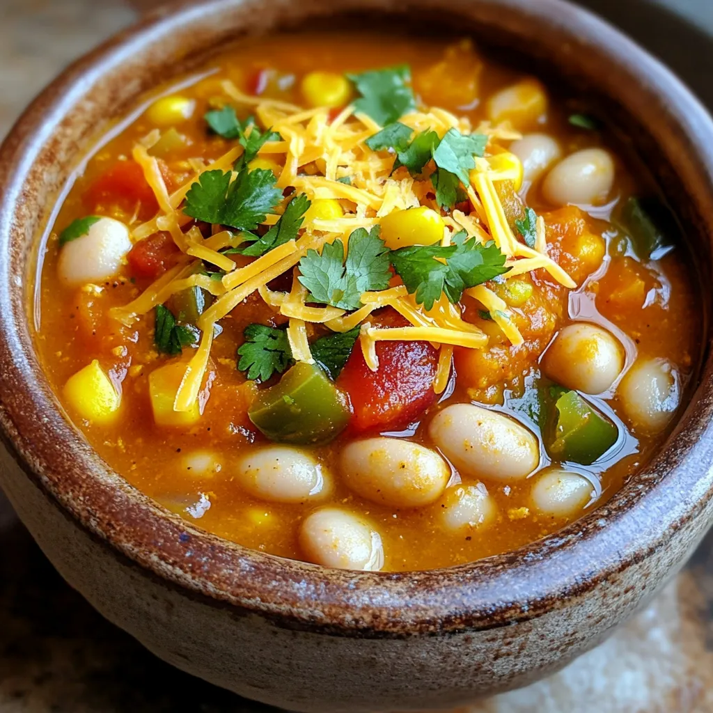 - 2 cups pumpkin puree - 1 can (15 oz) white beans - 1 can (14 oz) diced tomatoes with green chilies - 1 medium onion, finely chopped - 2 cloves garlic, minced - 1 bell pepper, diced - 2 cups vegetable broth - 1 tablespoon chili powder - 1 teaspoon ground cumin - ½ teaspoon smoked paprika - Salt and black pepper Pumpkin white bean chili is a warm, hearty dish. It’s easy to prepare and packed with flavor. The pumpkin puree gives it a smooth texture. White beans add creaminess and protein, making it filling. Diced tomatoes with green chilies offer a touch of heat and tang. I often use fresh ingredients. A finely chopped onion adds sweetness. Minced garlic gives depth. You can choose any bell pepper you like. Red adds sweetness, while green is more savory. For the broth, vegetable broth works best. It adds richness without overpowering the other flavors. Chili powder brings warmth, while cumin adds an earthy note. Smoked paprika gives a subtle smokiness, making the chili more complex. Finally, salt and black pepper enhance all the flavors. This ingredient mix makes a delightful chili. It's great for family dinners or cozy nights in. Plus, you can easily adjust the spices to suit your taste. Start by gathering your ingredients. In the slow cooker, combine: - 2 cups pumpkin puree - 1 can (15 oz) white beans, drained and rinsed - 1 can (14 oz) diced tomatoes with green chilies, including the juices - 1 medium onion, finely chopped - 2 cloves garlic, minced - 1 bell pepper, diced Stir these together well. The pumpkin adds a creamy texture. The beans give protein and fiber. The tomatoes and peppers add flavor and color. Now, mix in these ingredients to boost flavor: - 1 cup corn (fresh, frozen, or canned) - 2 cups vegetable broth - 1 tablespoon chili powder - 1 teaspoon ground cumin - ½ teaspoon smoked paprika - Salt and black pepper to taste Stir everything until well mixed. The broth will help cook the chili evenly. The spices will create a warm, tasty aroma as it cooks. Cover the slow cooker and set the heat. You can choose to cook on low for 6-8 hours or high for 3-4 hours. During cooking, the flavors blend and deepen. After the time is up, taste your chili. Adjust the seasoning if needed. Add more spices or salt if you want. Once satisfied, serve it hot. Enjoy the rich flavors and hearty texture. To make your pumpkin white bean chili even better, add more spices. You can try extra chili powder or cumin. I love to taste it while it cooks. This lets me find the perfect balance. Each time you taste, you can adjust the spices. The flavors will grow rich and deep. If your chili is too thick, add more vegetable broth. Use a little at a time. Stir well after each addition. If it's too thin, let it cook longer with the lid off. This helps it reduce and thicken. You can also mash some beans to help with thickness. This chili pairs well with warm crusty bread. Tortilla chips are also a great choice. For toppings, consider shredded cheese or diced avocado. Fresh cilantro adds a bright touch. A dollop of sour cream makes it creamy and rich. Enjoy experimenting with your favorites! {{image_4}} To keep this chili plant-based, focus on using fresh veggies and beans. Use vegetable broth instead of chicken broth. You can add more beans for protein, like kidney or black beans. Fresh herbs like cilantro can brighten the dish. If you want added creaminess, use coconut milk instead of sour cream. This keeps it vegan while adding a nice flavor twist. If you want to add meat, chicken or turkey works well. Use shredded rotisserie chicken for a quick option. Brown ground turkey in a pan before adding it to the slow cooker. This adds depth to the chili. For a heartier meal, try adding diced beef or sausage. Just make sure to cook it first, then mix it in. The meat adds a nice texture and flavor. To adjust the spice level, start with the basic spices first. If you like it hot, add more chili powder or a pinch of cayenne pepper. You can also add diced jalapeños for extra heat. If it’s too spicy, add a bit of sugar or more pumpkin to balance it out. Taste as you go, and make it just right for you! To store your pumpkin white bean chili, allow it to cool first. Place it in an airtight container. You can refrigerate it for up to five days. For longer storage, freeze the chili. Use freezer-safe bags or containers. Make sure to leave some space for expansion. It can last up to three months in the freezer. When reheating, I suggest using the stove for the best results. Pour the chili into a saucepan. Heat it over medium heat, stirring often. This helps keep the texture smooth. You can also use a microwave. Place it in a microwave-safe bowl. Cover it loosely, then heat in short bursts. Stir between intervals to ensure even heating. In the fridge, your pumpkin white bean chili stays good for about five days. If you freeze it, it will remain safe for three months. However, for the best taste, try to eat it within one month. Always check for any off smells or changes in texture before eating. Enjoy your leftovers while they are still fresh! Yes, you can use fresh pumpkin. Start by choosing a sugar pumpkin. Cut it in half, remove the seeds, and roast it until soft. This usually takes about 45 minutes at 400°F. After roasting, scoop out the flesh and blend it until smooth. You can use this fresh pumpkin in your chili just like the canned puree. It adds a lovely texture and flavor! You have many options for beans! Besides white beans, you can use pinto beans, kidney beans, or black beans. Each type will give a different taste and texture. Feel free to mix and match to find your favorite combo. Just remember to drain and rinse canned beans for the best result. Yes, this recipe is gluten-free. All the ingredients used, like pumpkin, beans, and spices, contain no gluten. Always check labels on canned goods to be safe. If you use any toppings like cheese or sour cream, ensure they are also gluten-free if needed. Enjoy this hea