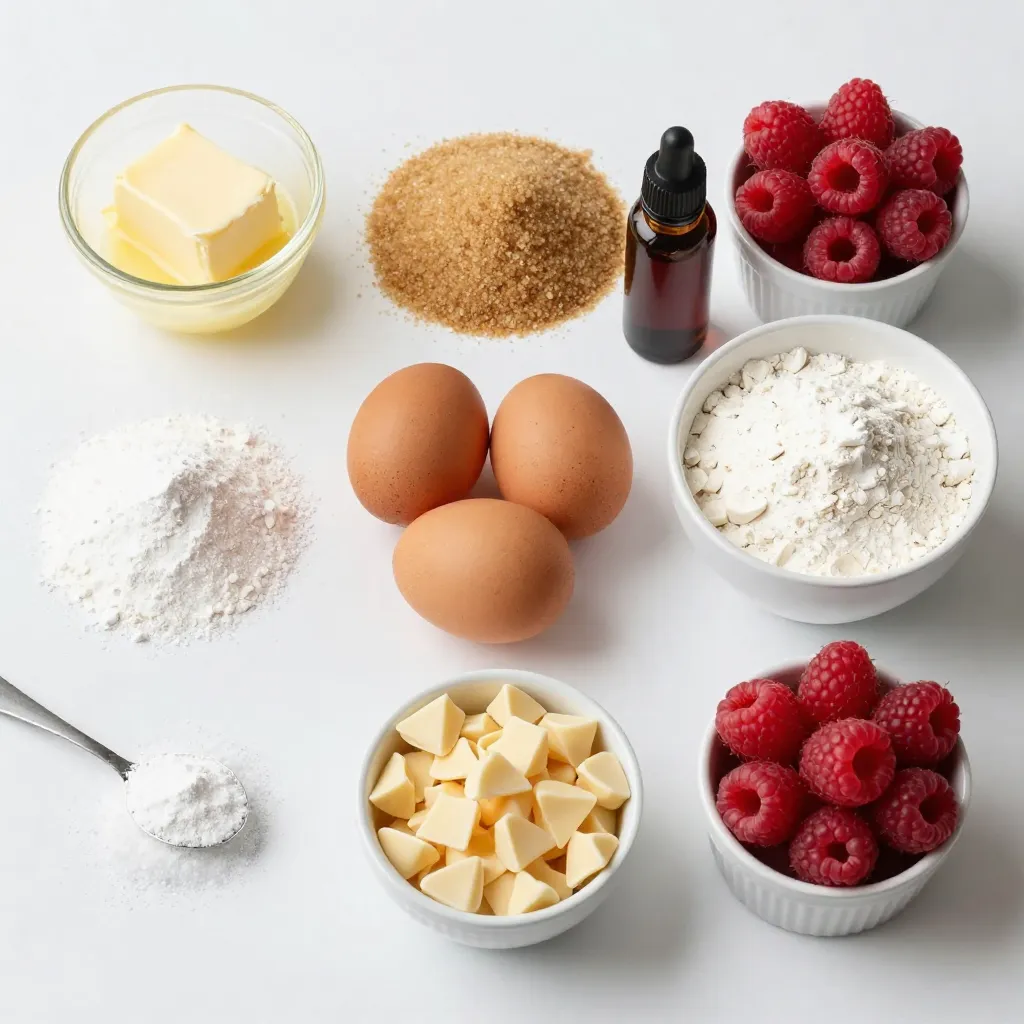 These ingredients create a sweet and rich base. The butter gives a nice, smooth texture. Both sugars add depth and moisture. Two eggs help bind everything together while the vanilla adds a lovely aroma. The flour, baking powder, and salt bring structure and balance. The white chocolate chips offer creamy sweetness. Finally, the fresh raspberries add bright flavor and color.