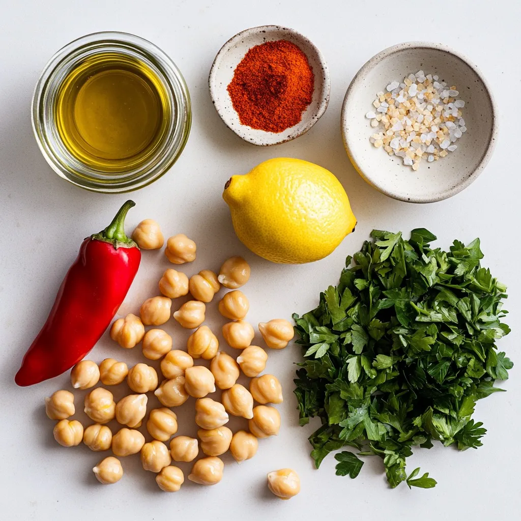 To start, gather your ingredients. You need canned chickpeas, a roasted red pepper, tahini, olive oil, garlic, lemon juice, and ground cumin. Place all these ingredients into your food processor. Blend them on high speed until the mix is smooth. If the mixture sticks to the sides, stop and scrape it down. This step ensures every ingredient mixes well.