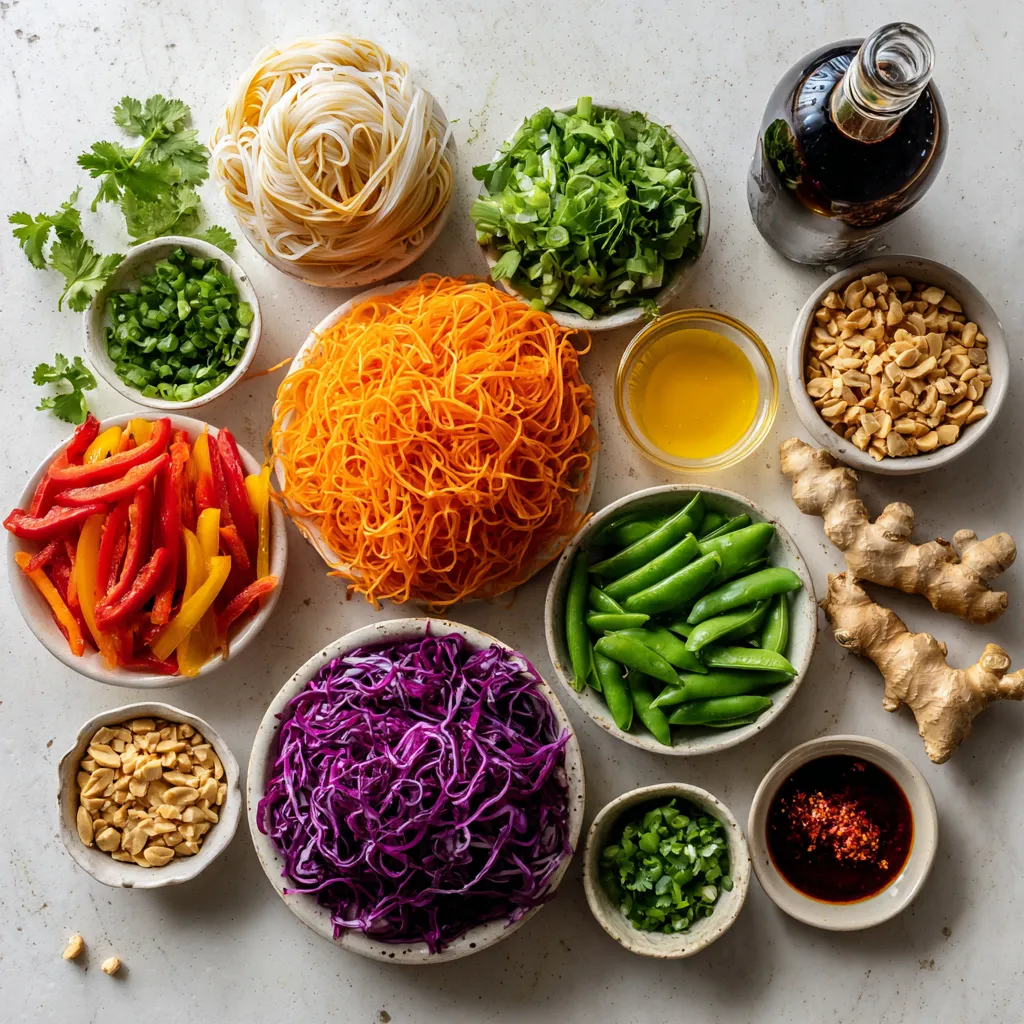 In a large mixing bowl, add the cooled rice noodles, shredded carrots, julienned bell pepper, trimmed snap peas, thinly sliced red cabbage, chopped cilantro, and sliced green onions.