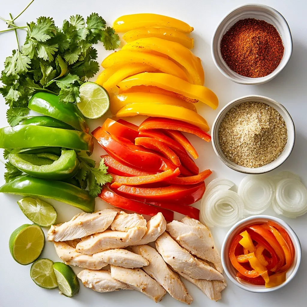When I make sheet pan chicken fajitas, I start with fresh, high-quality ingredients. The chicken breasts need to be boneless and skinless, as they cook evenly and are easy to slice. I prefer large red and green bell peppers for their sweetness and crunch. The onion adds a nice flavor and helps create that classic fajita taste.