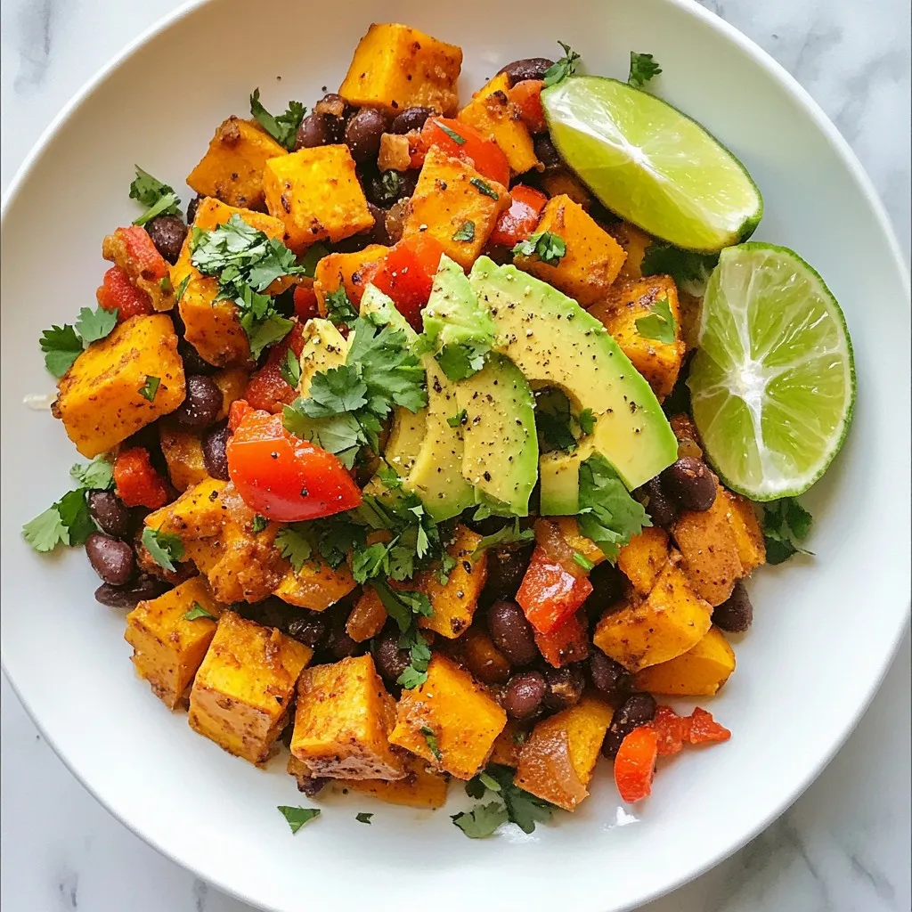 A vibrant and flavorful skillet dish featuring sweet potatoes, black beans, and spices, topped with avocado and cilantro.