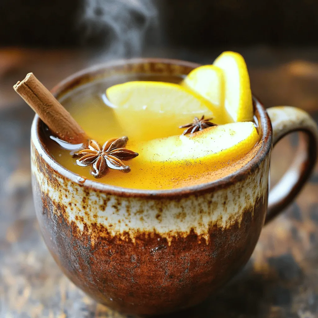 To make the spiced apple cider hot toddy, I start by pouring 4 cups of apple cider into a medium saucepan. I set the heat to medium. As the cider warms, I add 1 tablespoon of honey. I stir gently until the honey dissolves completely. Next, I add 1 cinnamon stick, 2-3 star anise pods, 3-4 whole cloves, and a thinly sliced piece of fresh ginger. These spices create a warm and cozy aroma. I let the mixture heat until it steams, about 5-7 minutes. It’s important not to let it boil. When it’s steaming hot, I remove it from the heat and stir in the juice of half a lemon. This adds a bright flavor to the cider.