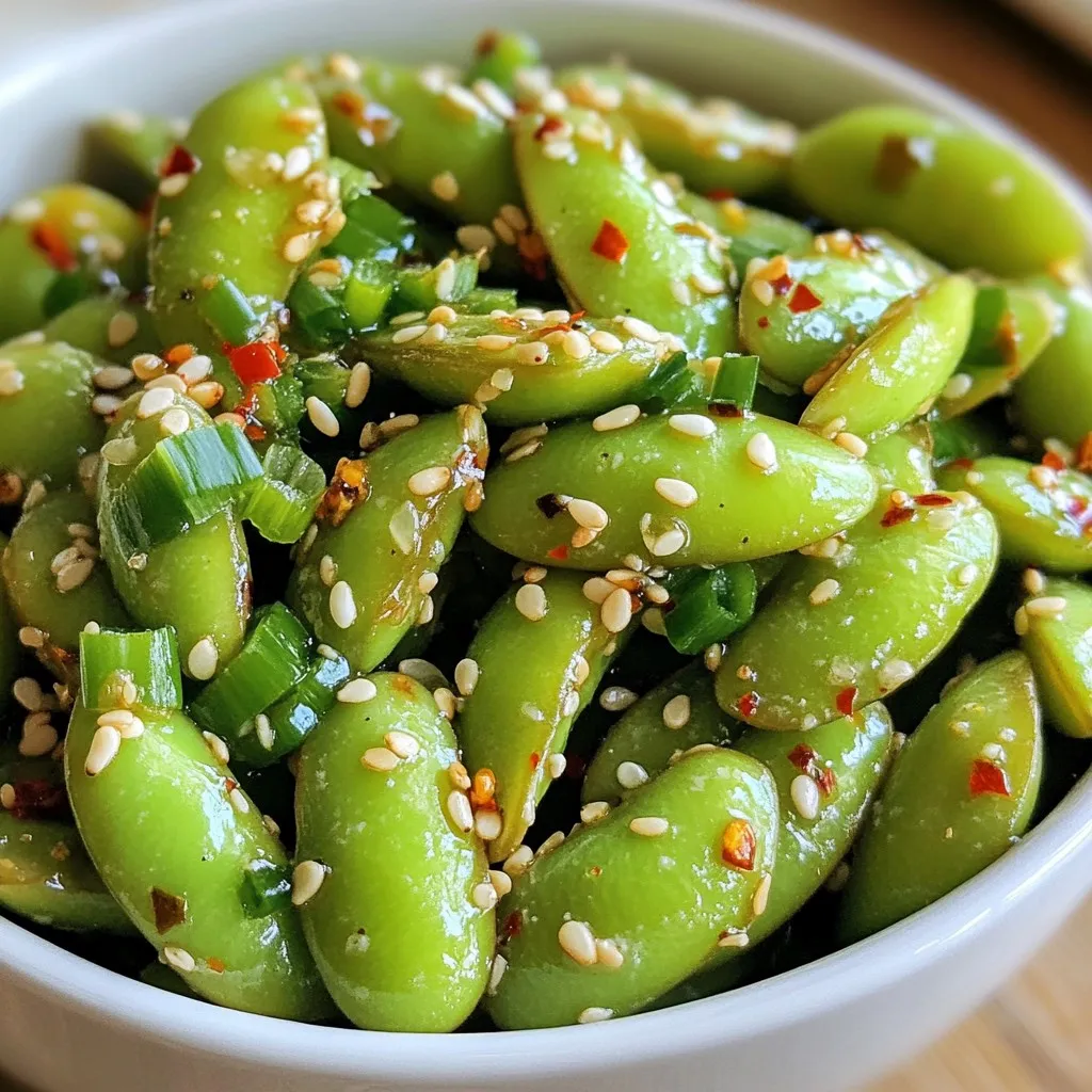 Once cooked, take the skillet off the heat. Squeeze 1 tablespoon of fresh lime juice over the edamame. Toss again to mix everything together. Season with sea salt to taste. For a lovely finish, sprinkle chopped green onions and toasted sesame seeds on top. Serve the spicy garlic edamame in a bright bowl, maybe with lime wedges on the side. Enjoy this bold snack!