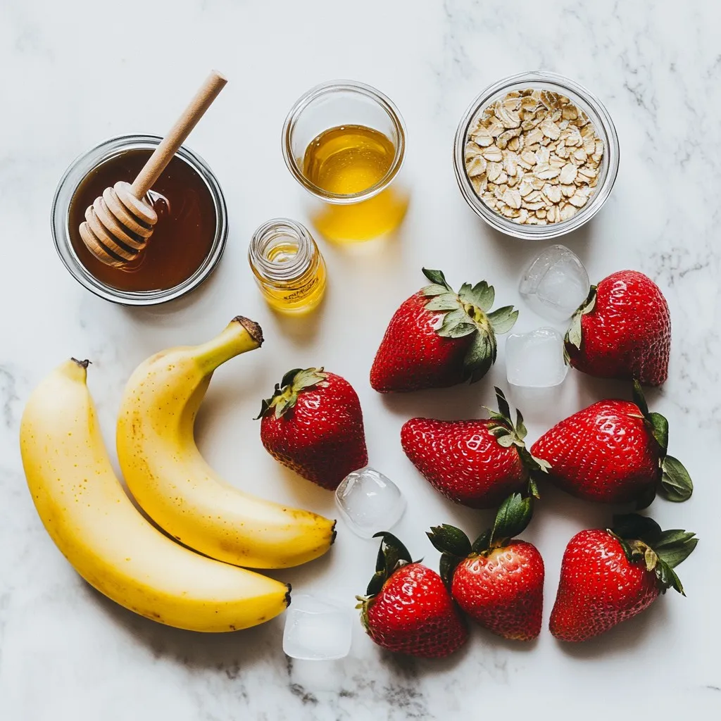 Start by rinsing fresh strawberries under cold water. Remove the green tops. If using frozen strawberries, you can skip this step. Next, peel your ripe banana and break it into chunks. Measure out half a cup of rolled oats. This adds creaminess to your smoothie. Lastly, grab your almond milk, honey or maple syrup, vanilla extract, and a pinch of cinnamon.