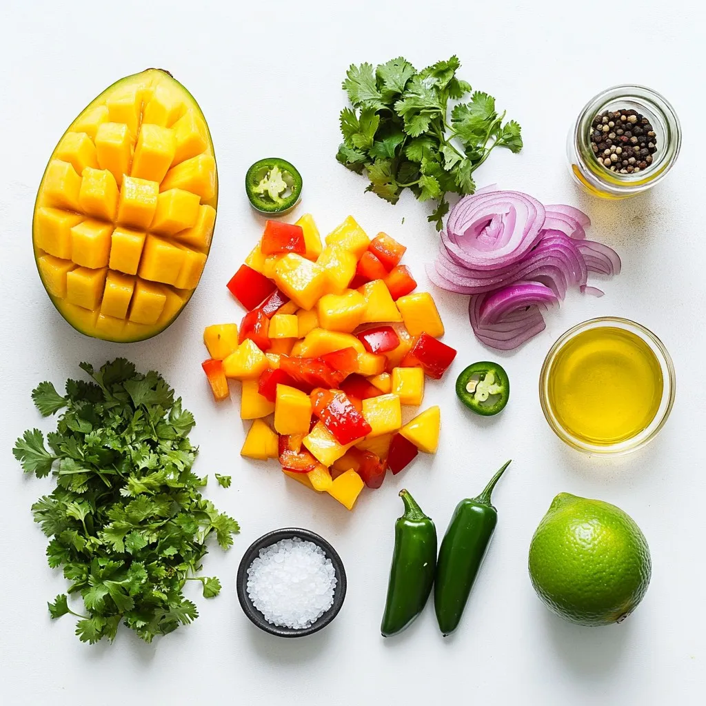 To make a great Tropical Mango Salsa, you need these simple ingredients. Ripe mangoes are key. They should be juicy and sweet. The red onion adds a mild bite that balances the salsa. I love the sweet crunch of the red bell pepper. It gives a nice color too.