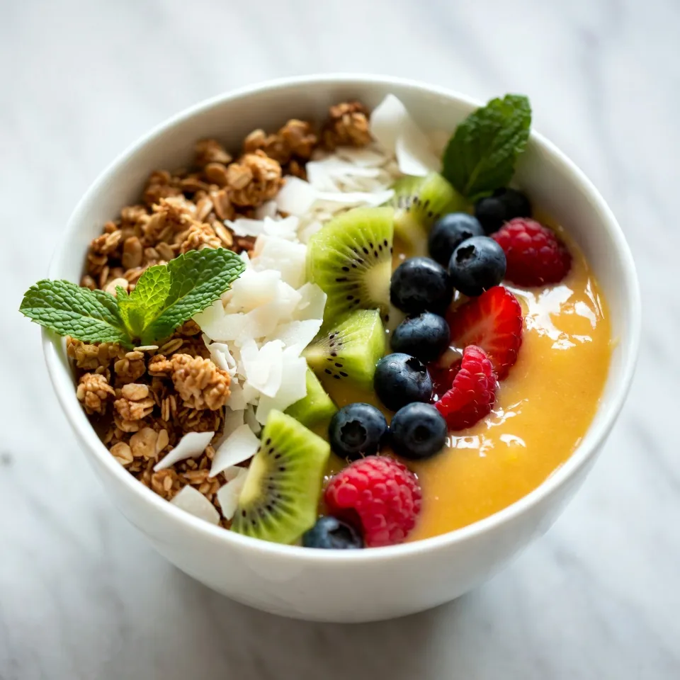 To make your Tropical Mango Smoothie Bowl, gather these fresh and vibrant ingredients: - 2 ripe mangoes, peeled and diced - 1 frozen banana - 1/2 cup coconut milk (or any milk of choice) - 1/2 cup Greek yogurt (or dairy-free yogurt) - 1 tablespoon honey or agave syrup (optional for sweetness) - 1/4 cup granola (your favorite variety) - 1/4 cup shredded coconut (unsweetened for a healthier option) - 1/4 cup diced kiwi (for a tangy contrast) - Fresh berries (such as strawberries and blueberries, for topping) - Fresh mint leaves (for garnish) Each ingredient adds a unique flavor and texture. The mangoes provide a sweet, tropical taste. The frozen banana makes the smoothie creamy. Coconut milk adds a rich base, while Greek yogurt gives a nice protein boost. Honey or agave syrup can add extra sweetness if desired. Granola and shredded coconut offer crunch. Diced kiwi adds a fun tanginess. Fresh berries not only taste good but also brighten the bowl. Finally, mint leaves give a fresh aroma and look stunning. This mix of ingredients makes your smoothie bowl both nourishing and delicious! {{ingredient_image_2}} To start, you need to prepare the mangoes. First, take a ripe mango and hold it steady. Use a sharp knife to slice off the skin. Be careful not to cut too deeply. Then, cut the mango flesh away from the pit. Dice the mango into small cubes and set them aside. Using a frozen banana is key. It adds creaminess to your smoothie bowl. A fresh banana will not give you the same texture. Make sure to slice the banana before you freeze it, so it blends easily later. Now, let’s blend! In a high-powered blender, add the diced mangoes, frozen banana, coconut milk, Greek yogurt, and honey or agave syrup if you want it sweeter. Blend on high speed until the mixture becomes smooth. If you want a thinner consistency, add a little more coconut milk. Blend again until mixed well. The goal is a velvety texture, so take your time. Once your smoothie base is ready, pour it into a large bowl. Take a moment to admire the color! For a great look, layer your toppings. Start with granola at the base. Add shredded coconut next. Add diced kiwi and a mix of fresh berries on top. Use colorful fruits to make it pop. Finish with mint leaves for a fresh touch. This will make your smoothie bowl not just tasty but also beautiful! To get the right thickness for your smoothie bowl, coconut milk is key. If it’s too thick, add a bit more coconut milk. Blend well to mix it in. For a lighter option, use almond or oat milk. They both work nicely and keep it dairy-free. Make your smoothie bowl pop with fun toppings. Use fresh berries like strawberries and blueberries. They add color and flavor. Shredded coconut gives a nice crunch, while diced kiwi adds a tangy twist. You can even sprinkle some granola on top for extra texture. A few mint leaves will make it look fresh and bright. This smoothie bowl is great for breakfast or a snack. It fills you up and gives energy. Enjoy it after a morning workout or as an afternoon treat. You can pair it with whole-grain toast or a handful of nuts for a balanced meal. Pro Tips Choose Ripe Mangoes: Make sure to pick mangoes that are slightly soft to the touch and have a sweet aroma for the best flavor in your smoothie bowl. Use Frozen Bananas: Freezing your bananas not only adds creaminess but also helps chill the smoothie bowl, making it a refreshing treat on a hot day. Customize Your Toppings: Feel free to mix and match toppings based on your preferences; nuts, seeds, or other fruits can add different textures and flavors. Blend to Your Liking: Blend the ingredients until smooth, but if you want a thicker consistency, blend less or add less liquid. Adjust to your ideal texture! {{image_4}} You can mix different tropical fruits for a fun twist. Consider adding pineapple, papaya, or passion fruit. These fruits bring unique tastes and colors. You can also use seasonal fruits like strawberries in spring or blueberries in summer. These fruits not only taste great but also give your smoothie bowl a fresh look. If you want a dairy-free option, use coconut yogurt or almond yogurt. Both will keep your smoothie rich and creamy. For the milk, try almond milk, oat milk, or soy milk. Each of these options gives a different taste. They work well with the mango and banana flavors. Adding superfoods boosts the nutrition of your smoothie bowl. Consider chia seeds or flaxseeds for extra fiber and omega-3s. You can also toss in spinach for a green boost. If you want more protein, add nut butter or protein powder. These changes make your bowl not only tasty but also filling and healthy. To keep your smoothie bowl fresh, store it in an airtight container. Place it in the refrigerator. It will stay good for up to two days. If you want to freeze your smoothie bowl, pour the mixture into freezer-safe containers. Leave some space at the top, as it may expand when frozen. It can last up to a month. When you're ready to eat it, thaw it overnight in the fridge. Mangoes stay fresh for about five days at room temperature. If you refrigerate them, they can last up to a week. Bananas, especially frozen ones, are best used within three months for optimal flavor. Watch for spoilage signs like soft spots or a sour smell. For mangoes, check for wrinkling or a mushy feel. Bananas will turn brown and soft when they are past their prime. Always use fresh ingredients to enjoy the best flavor in your smoothie bowl. Yes, you can make a smoothie bowl ahead of time. To prepare in advance, blend your smoothie base and store it in an airtight container. Keep it in the fridge for up to 24 hours. When you are ready to enjoy, pour it into a bowl and add fresh toppings. If you want to keep it longer, freeze the base. To serve, let it thaw in the fridge overnight. If you don't have mango, you can use other fruits. Pineapple or papaya works well for a tropical taste. Bananas add creaminess, while berries bring a sweet-tart flavor. Choose fr