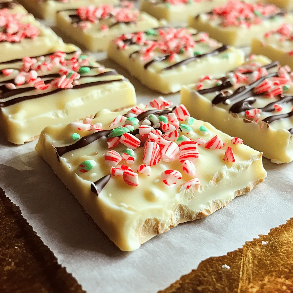 To make White Chocolate Peppermint Bark, first, gather your ingredients. You will need white chocolate chips, crushed peppermint candies, peppermint extract, sea salt, and optionally, dark chocolate chips. Start by lining a baking sheet with parchment paper. Melt the white chocolate in the microwave in short bursts. Stir until smooth, then add the peppermint extract and salt. Fold in the crushed candies. Spread this mixture on the baking sheet and sprinkle more candies on top. Let it cool to set, then break into pieces.